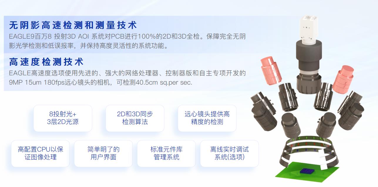 环状光源和多投射系统能完全消除高密度元件和高元件对PCB产生的阴影影响。
