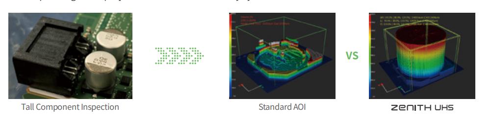 由于阴影投射在靠近高部件的较短部件上,测量带有高部件的电路板长期以来一直是 AOI 面临的挑战。作为可选功能(9 向投影),Zenith UHS处理高达 25 毫米的组件。 Zenith UHS 通过以下方式克服了元件阴影挑战结合多投影莫尔干涉测量系统。