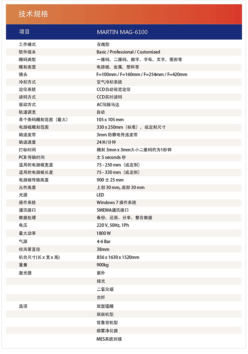 产品用途:MartinMAG-6100系列激光镭雕机(CO2/UV/GN/FIBER)可在多种材料上进行字符、图形、条形码和二维码等标识处理,广泛应用于机械电子、汽车电子、半导体、航空等行业。可轻松实现在电路板、金属、陶瓷塑胶、铝、橡胶等物品上的标识