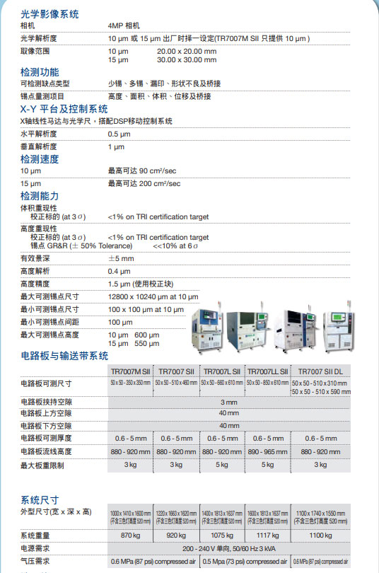 德律TR7007 SII 3D SPI,德律TR7007 SII 3D 在线SPI锡膏检测技术参数: