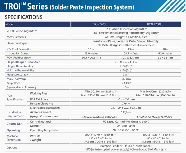 奔创在线3D SPI 7700E TROI-7700E Series技术参数: