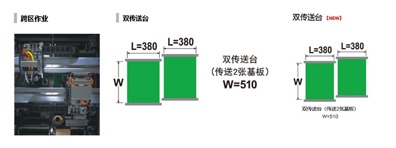 进一步改进了双传送台,使基板的对应能力得以增强(最大基板宽度达510mnm),而且还实现了高速传送,基板更换时间也大幅缩短