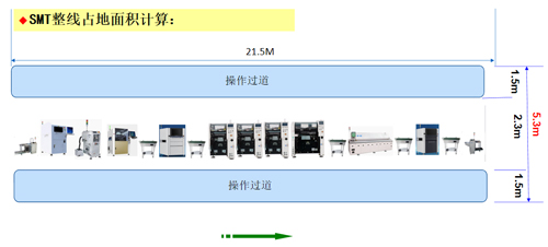 线体总宽度:2.3M(包含操作边和维护边) 总占地面积:21.5M*5.7M=122.55平方米