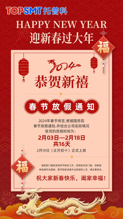 根据国务院春节放假通知,并结合公司实际情况,放假时间定于2月3日(腊月二十四)—2月18日(正月初十)上班。提前祝大家在新的一年里平安健康,工作顺利,阖家幸福,万事如意!