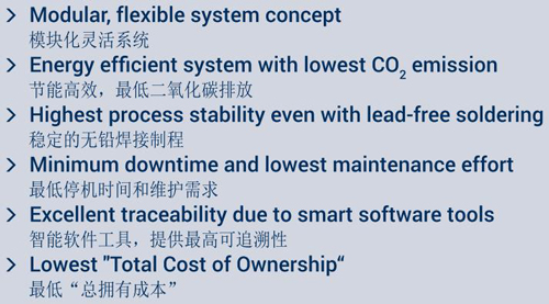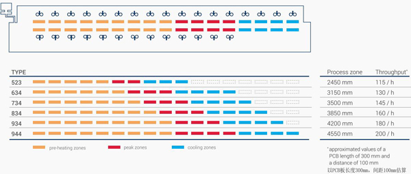 进行系统选型时,我们会考虑与应用相关的所有参数,例如产能,这是确定最佳制程区域长度的一项重要参数。如果涉及到频繁换线和轮班运营,就需要选择额外选项。确定所有制程参数后,您就可以放心选择一套最适合您的回流焊系统,实现可靠、高效的生产运营。VisionXC回流焊系统提供了广泛选项可供选择,确保始终为您提供最佳生产解决方案。
