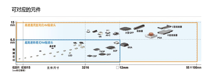 这是一种万能型贴装头,不仅具备高速性,而目还兼备通用性,从0201的超小型元件到55x100mm.高度15mm的大型元件均可对应。另外,通过与RM贴装头进行组合使用,还可高速贴装所有尺寸的元件。