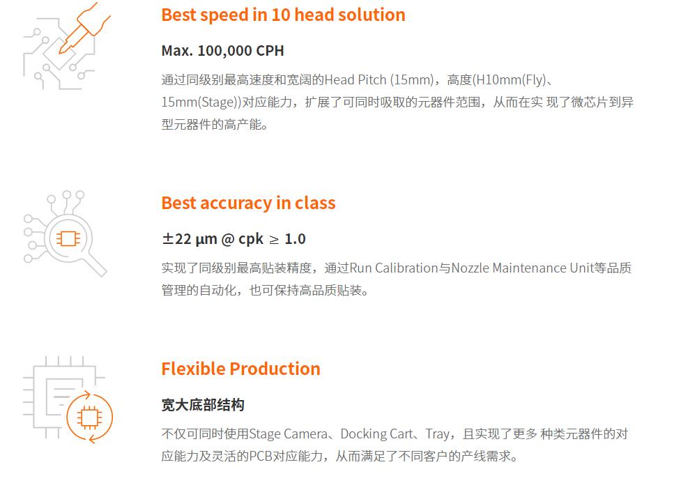 是同级别产品中可实现最高水平产能与品质的设备,是具备有灵活的产品对应能力 宽泛的选项功能及产线组合的泛用机。 通过革新功能可大幅提高使用者的便利性,实现快速换线。