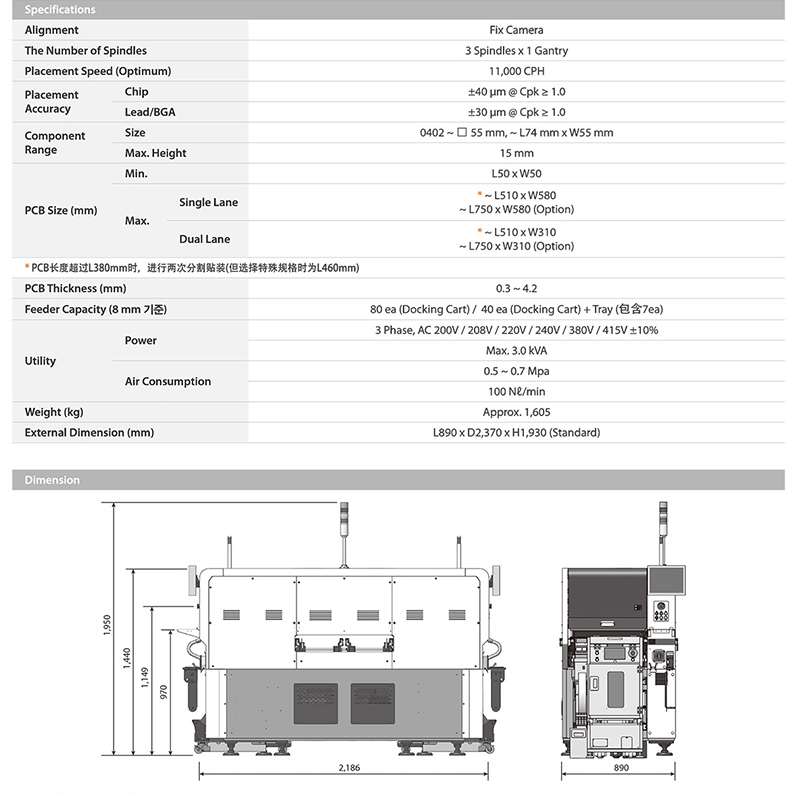 从0402到Max. 55mm元器件都能贴装,能处理最高15mm高的元器件。